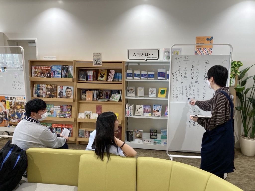 今回はプレ読書会ということで、INNOMAGによく来室する高校生2名に声を掛けて、江戸川乱歩の「人間椅子」を題材に行いました。