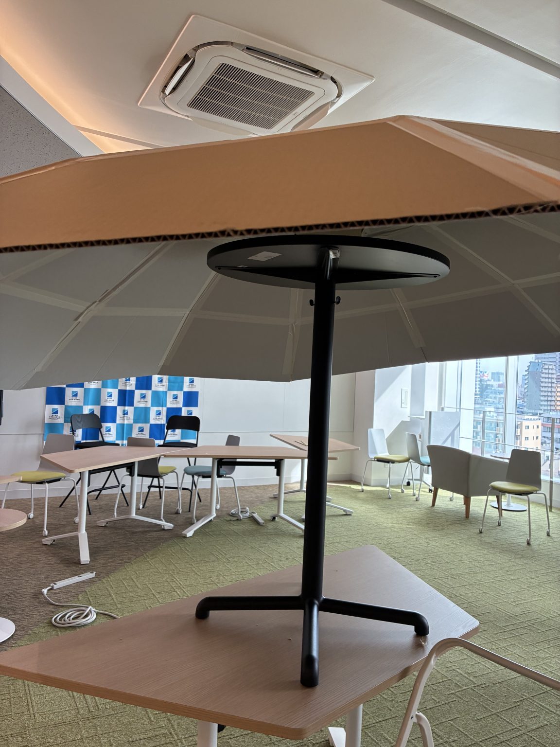 段ボールのカーブが想定より浅かったため、天井と接触してしまうアクシデントも。実際やってみて気づくことも多く、裾を広げるように切ることで対応するなど、体と頭脳を駆使しての作業となりました。