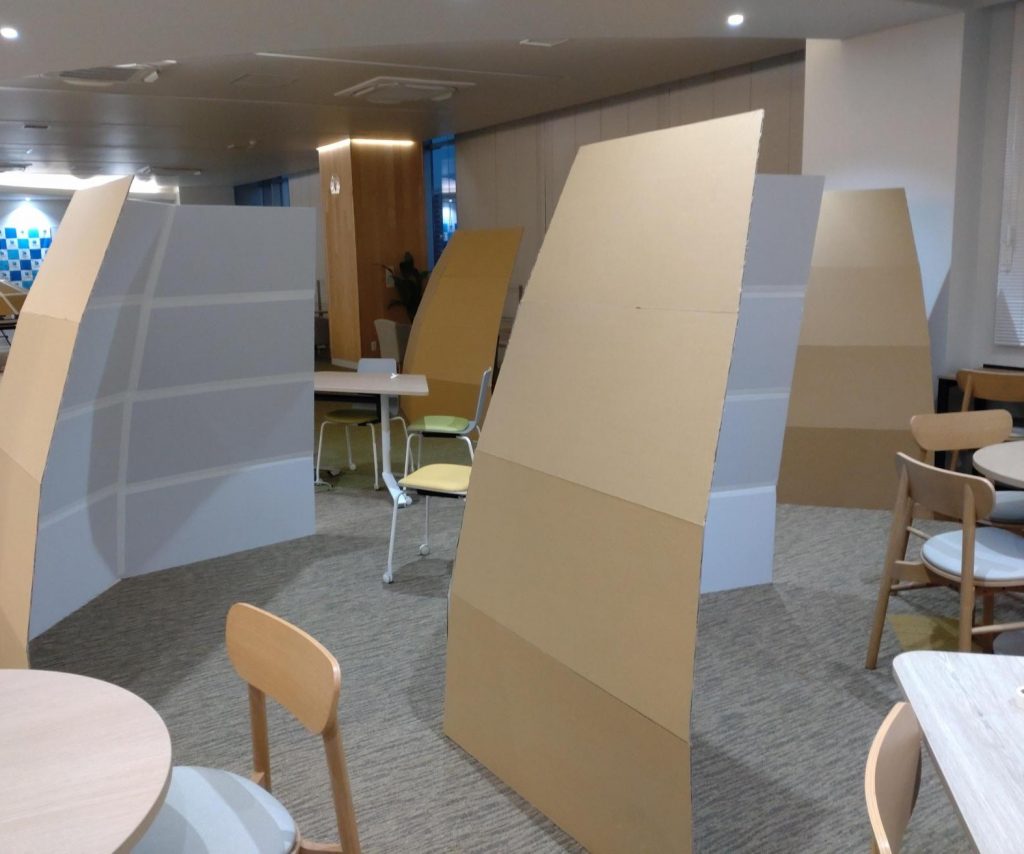 通常業務の合間に、業者発注した特大段ボールをひたすら図面に合わせて切っていきます。手作業で段ボールに角度をつけ慎重に切るというのはなかなか大変です。