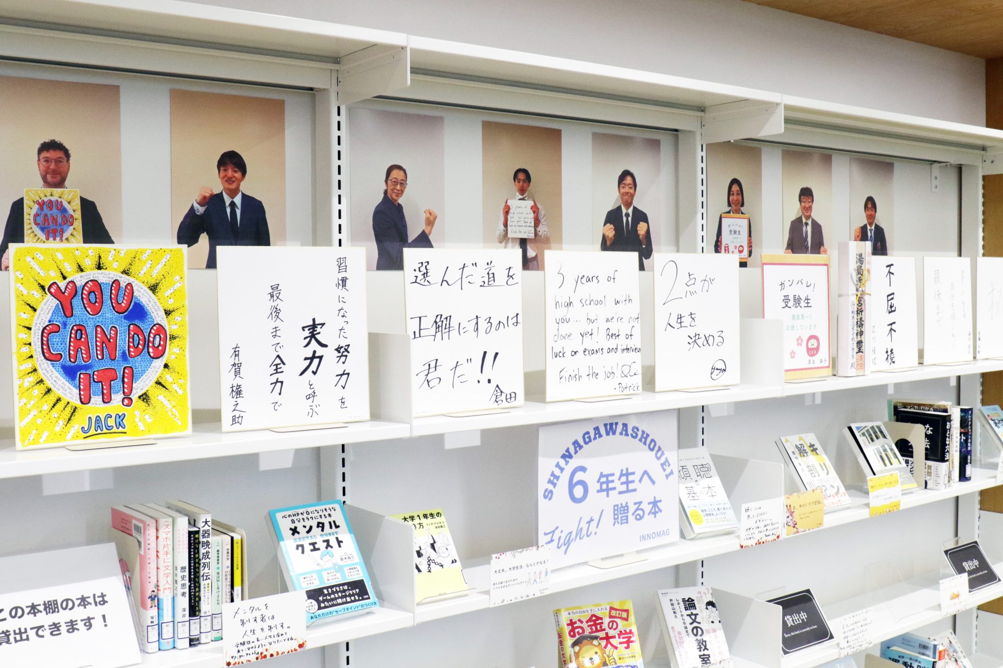 さらに、6年生担当の先生方からの色紙メッセージも展示しています。受験を間近に控えた生徒たちへ向けた、先生一人ひとりの温かい言葉が本とともに並び、より心のこもった空間になりました。