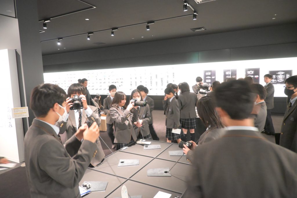 LTにおいて探究学習を進めている生徒たちは、世界的企業が築いてきたカメラの歴史や、現在も進化を続ける高度な光学技術を目の当たりにし、強い関心と高揚感を示していました。展示を前に、生徒たちは熱心に説明を読み込み、互いに感想を交わしながら学びを深める姿が印象的でした。
