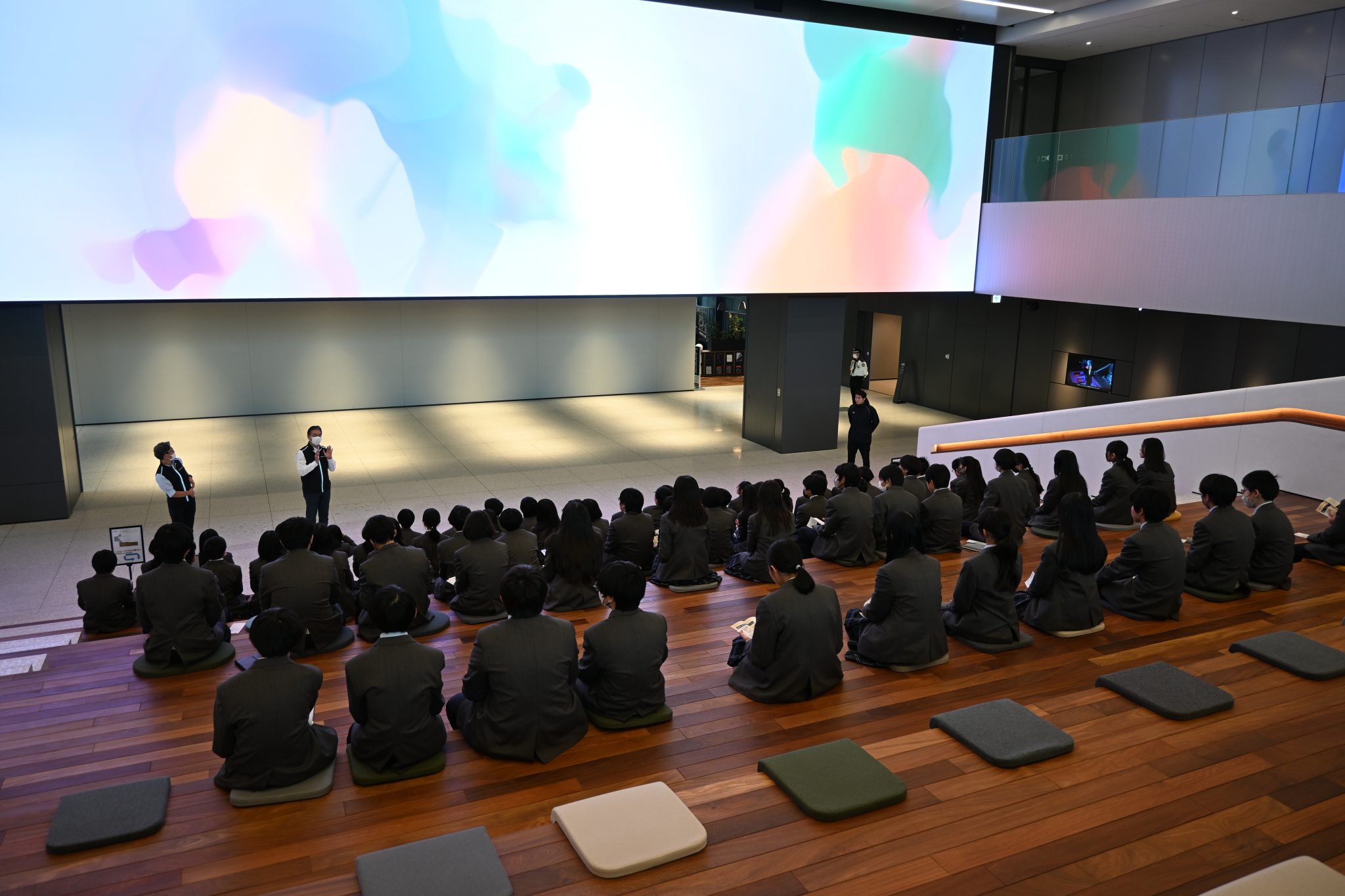 中学1年生は、12月10日および12日の二日間にわたり、学校に隣接するニコンミュージアムにて校外学習を実施しました。見学先であるニコンミュージアムでは、「ニコンの技術のシンボル」ともいえる合成石英ガラスインゴットをはじめ、半導体やエレクトロニクス、自動車などの産業分野、さらにはヘルス分野や学術分野に至るまで、幅広い分野の発展を支えてきた製品や最先端の技術が展示されています。