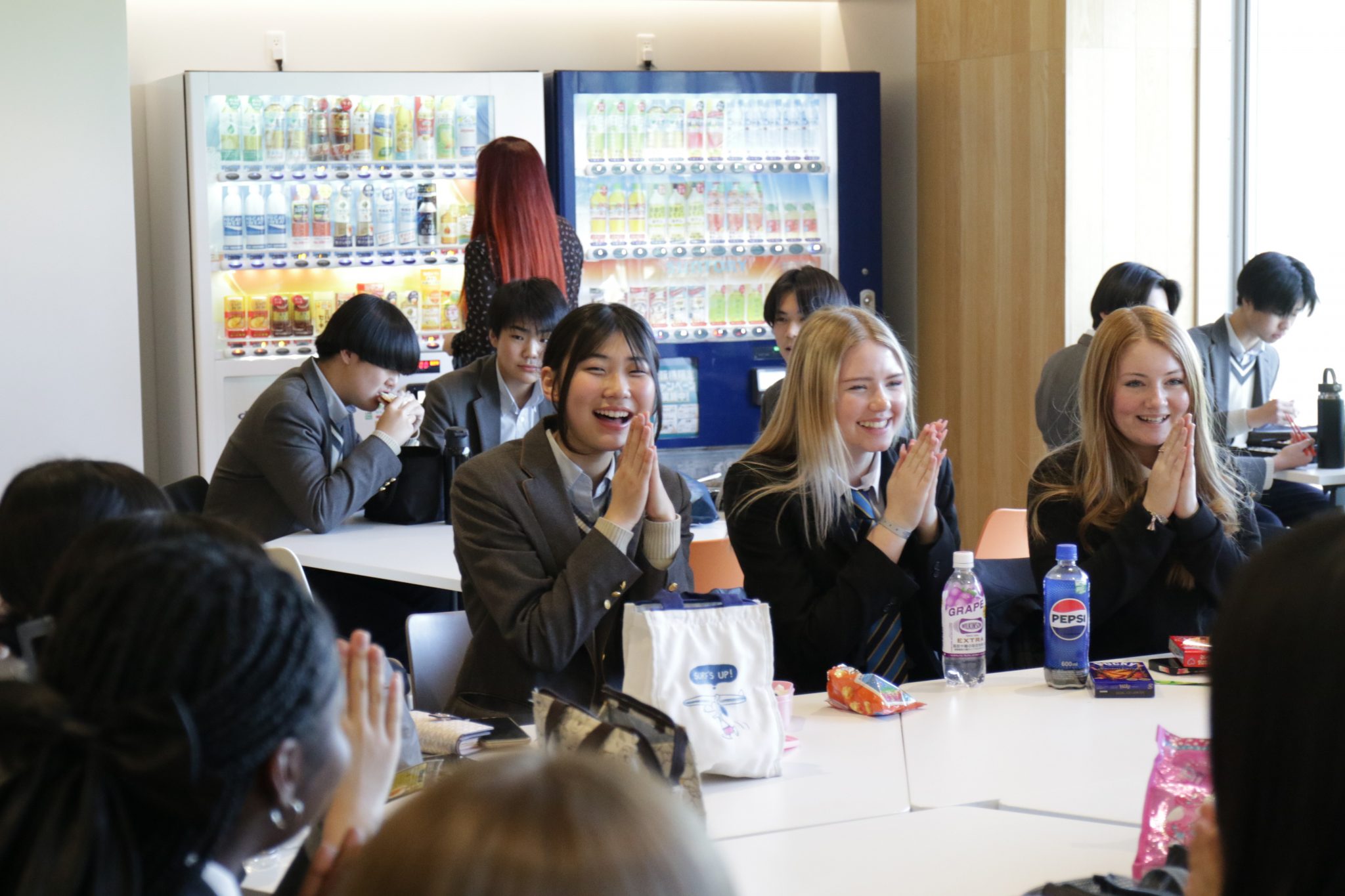 当日は歓迎会からスタートし、本校のさまざまなコースの生徒たちが参加。昼食を共にしながら英語や日本語で積極的に交流し、和やかな雰囲気の中で親睦を深めました。異なる文化背景をもつ同世代同士が直接対話することで、教室では得られないリアルな学びが生まれていました。